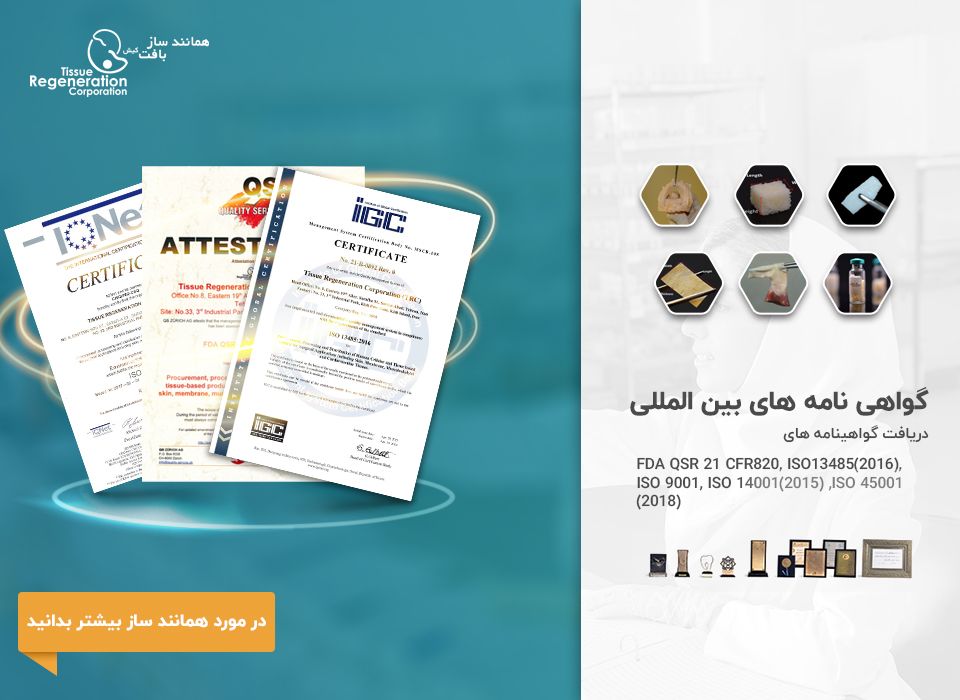 أنا الطبيب «أمين معتمدي»، أستخدم منتجات شركة “شركة استنساخ أنسجة كيش»، بما في ذلك طعم خيفي لغشاء التامور بالتجميد الجاف، والأدمة، ومسحوق العظام، والألواح المزروعة بالطبقة القشرية، منذ عام 2015 نظرا للجودة الممتازة.